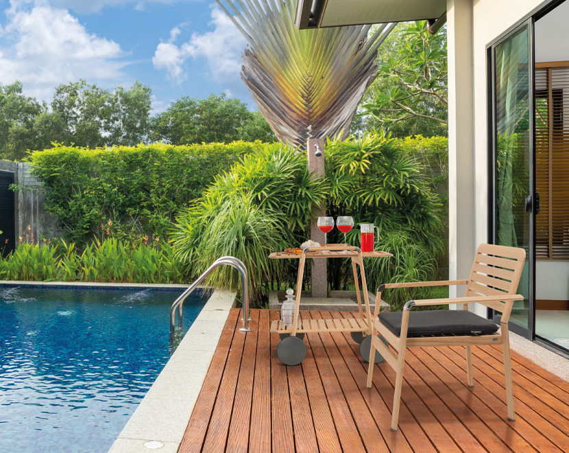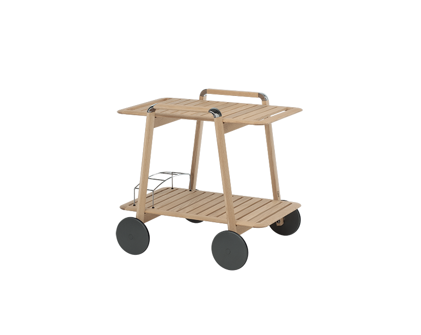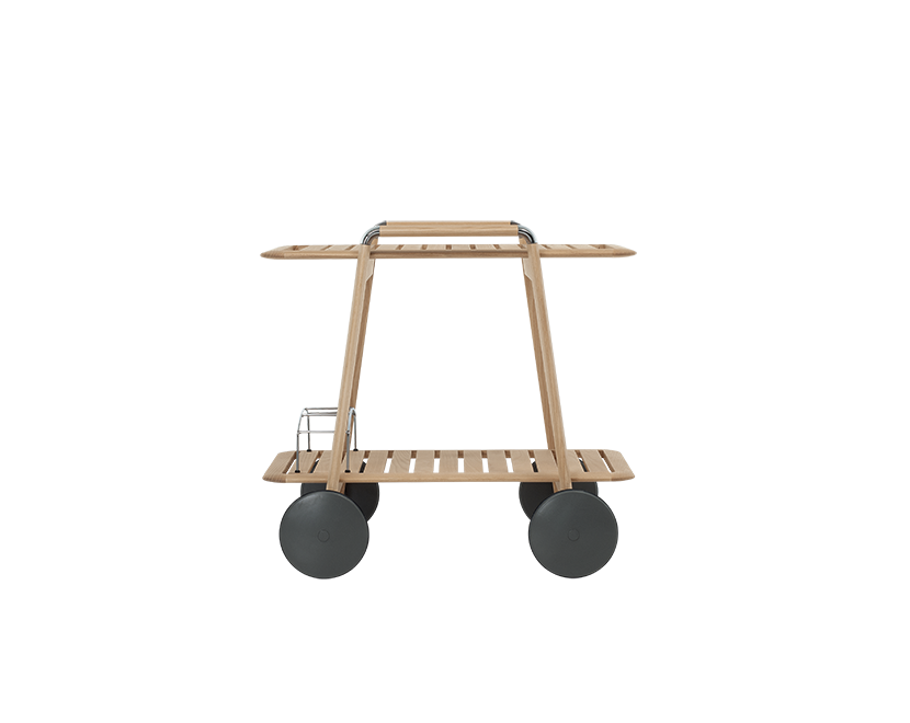 Ash wood trolley with two solid, wide shelves and a chrome metal food rack. Equipped with 4 rubber wheels for easy movement.
