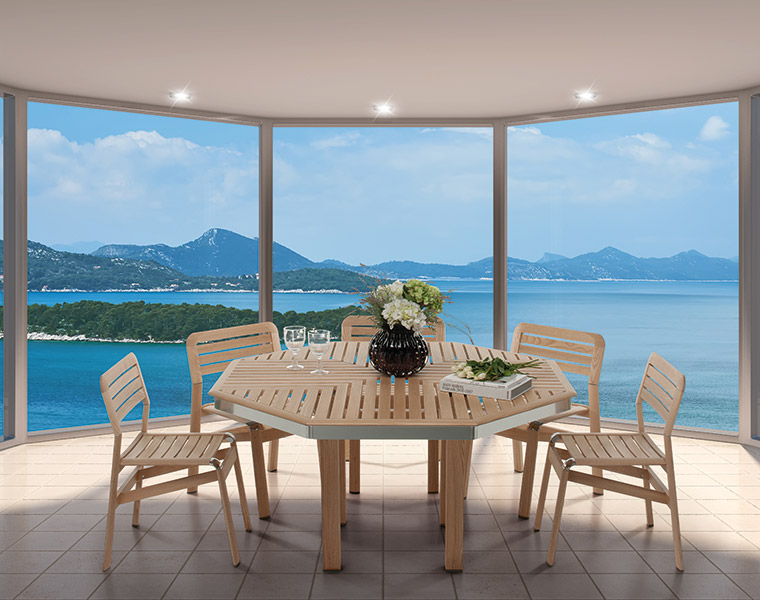 La struttura solida e duratura della collezione Iconica, come da tradizione aziendale, è caratterizzata da un design moderno con linee arrotondate progettato per adattarsi con stile ad ogni ambiente outdoor, che sia un portico, una bella terrazza o un gazebo.