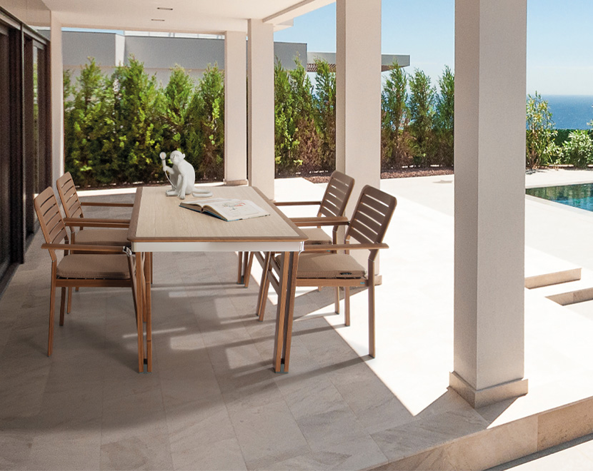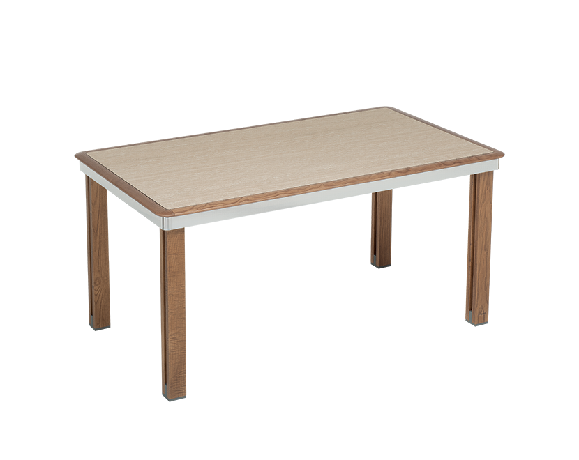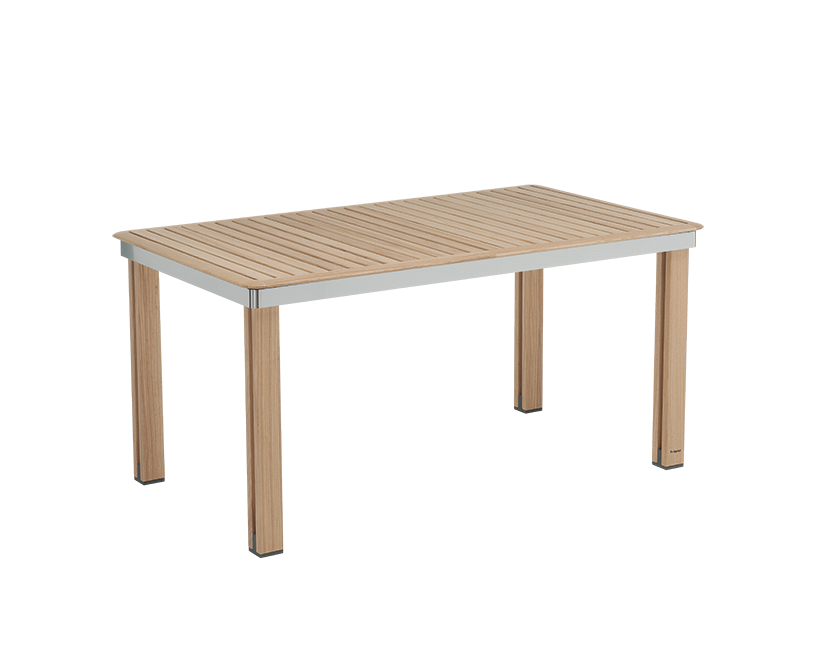 Tavolo rettangolare a 6 posti in legno di frassino con telaio in alluminio brillantato. Gambe in legno smontabili per poterlo riporre in uno spazio ridotto. E' stato progettato con un'adeguata altezza che permette l'inserimento delle sedie.